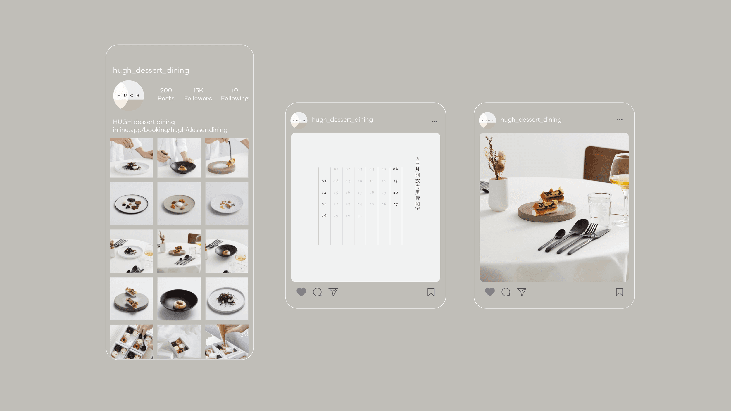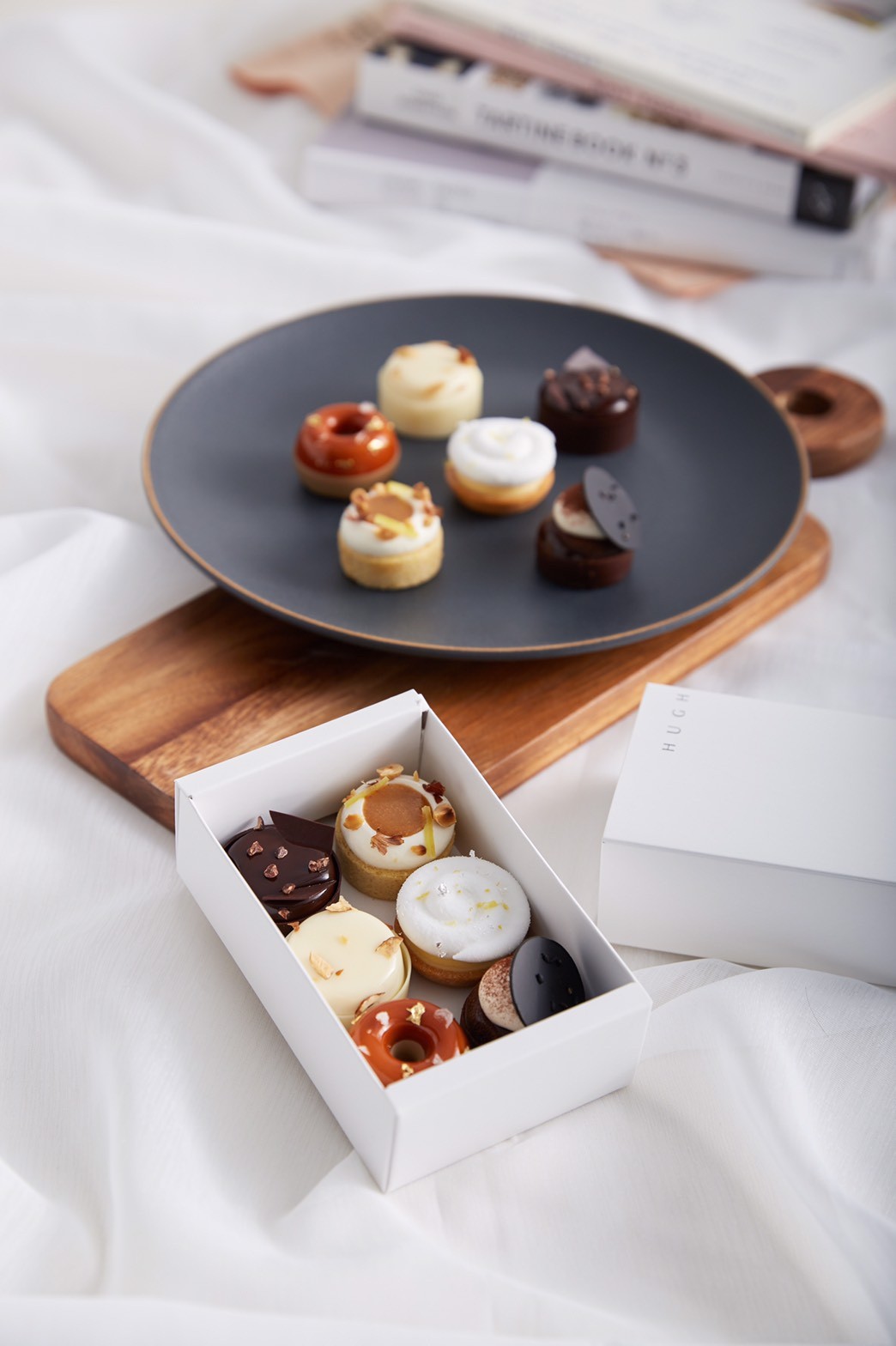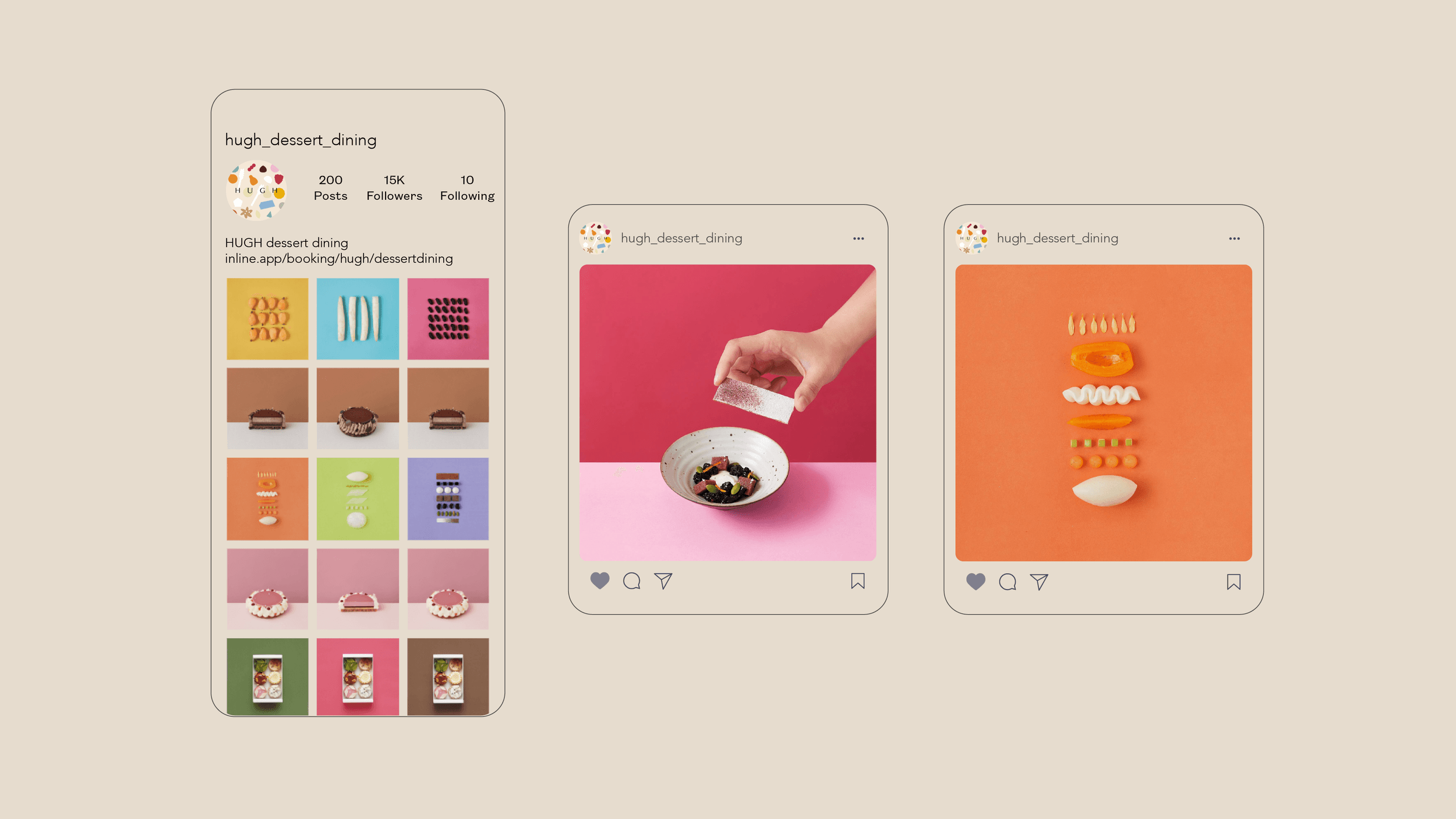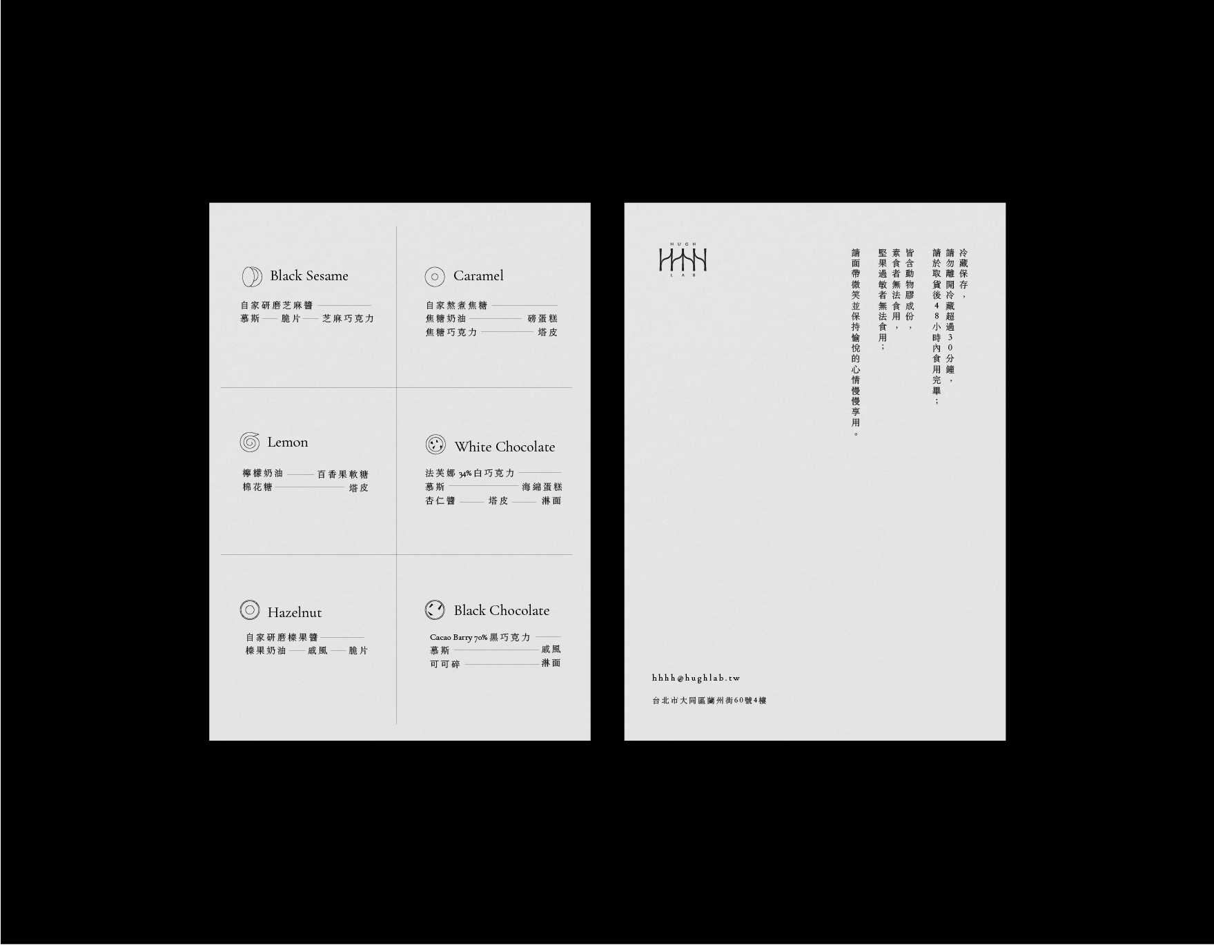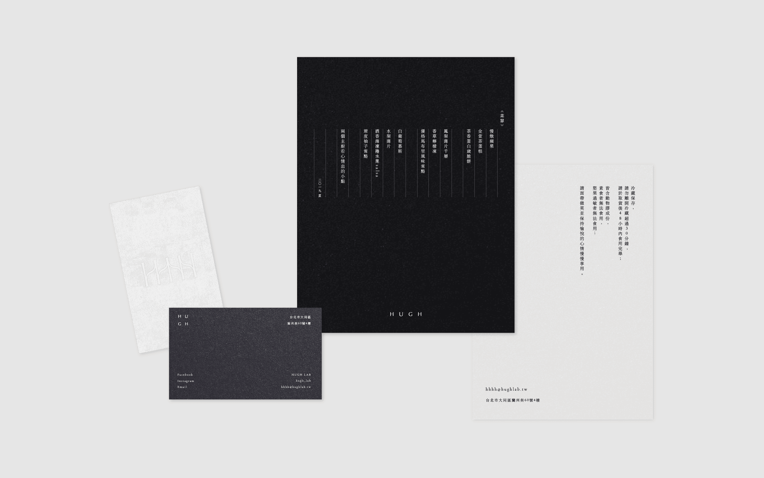 To reflect this innovative and modern experience, I developed a brand identity, assets, and packaging design for Hugh. The identity system showcases the combination of specialty and profession, highlighting the fine-dining quality and artistic desserts.