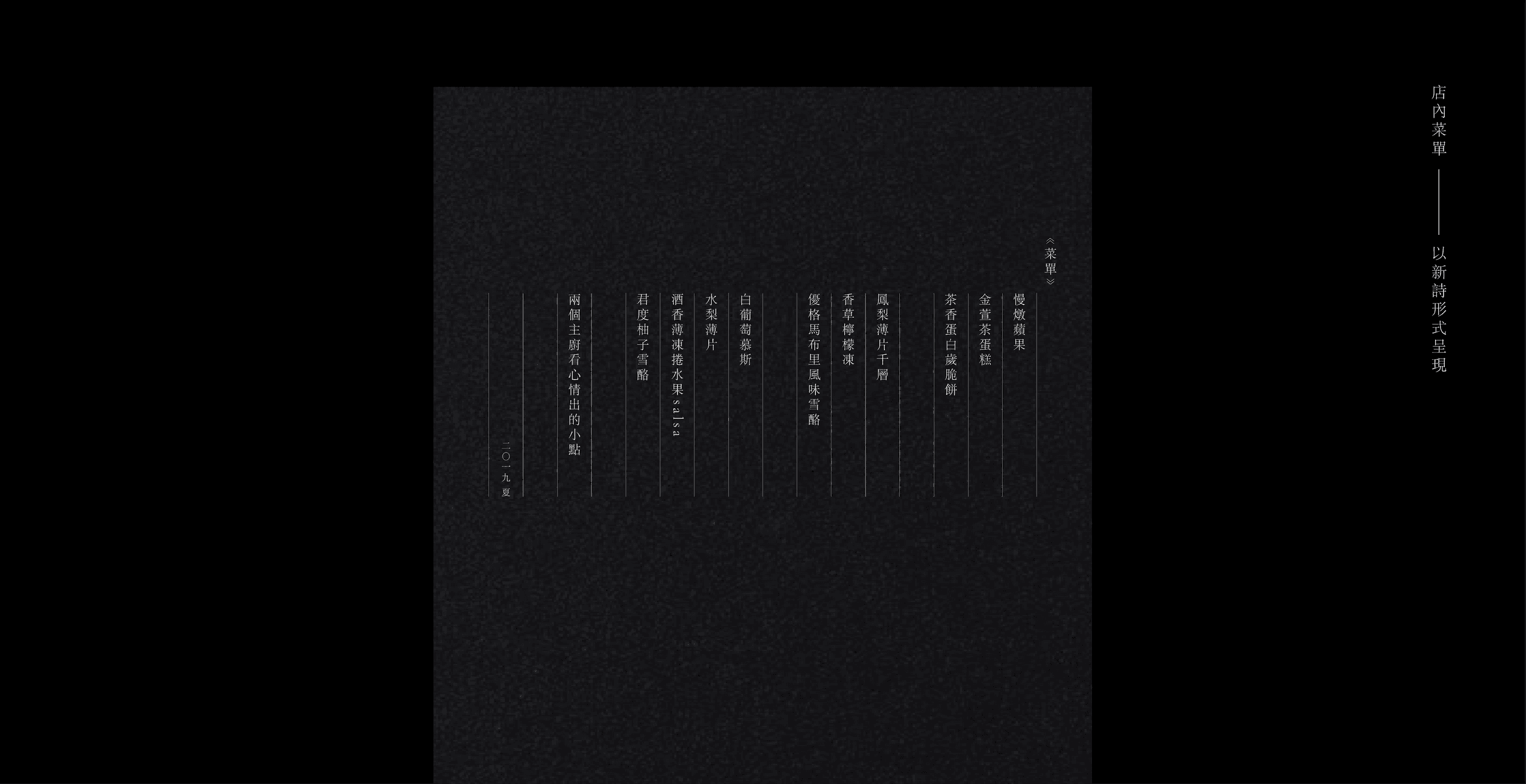The menu in Mandarin is designed to be read vertically, the same as the reading direction of Chinese New Poetry. To elevate the design and stand out from other restaurants, I challenged a new style with a poetic aesthetic and only wrote the ingredients, without the name of the meal, to present the essence of the concept.