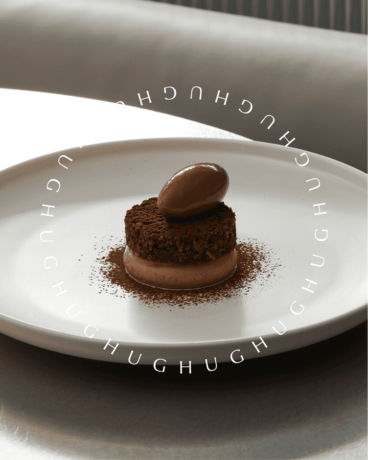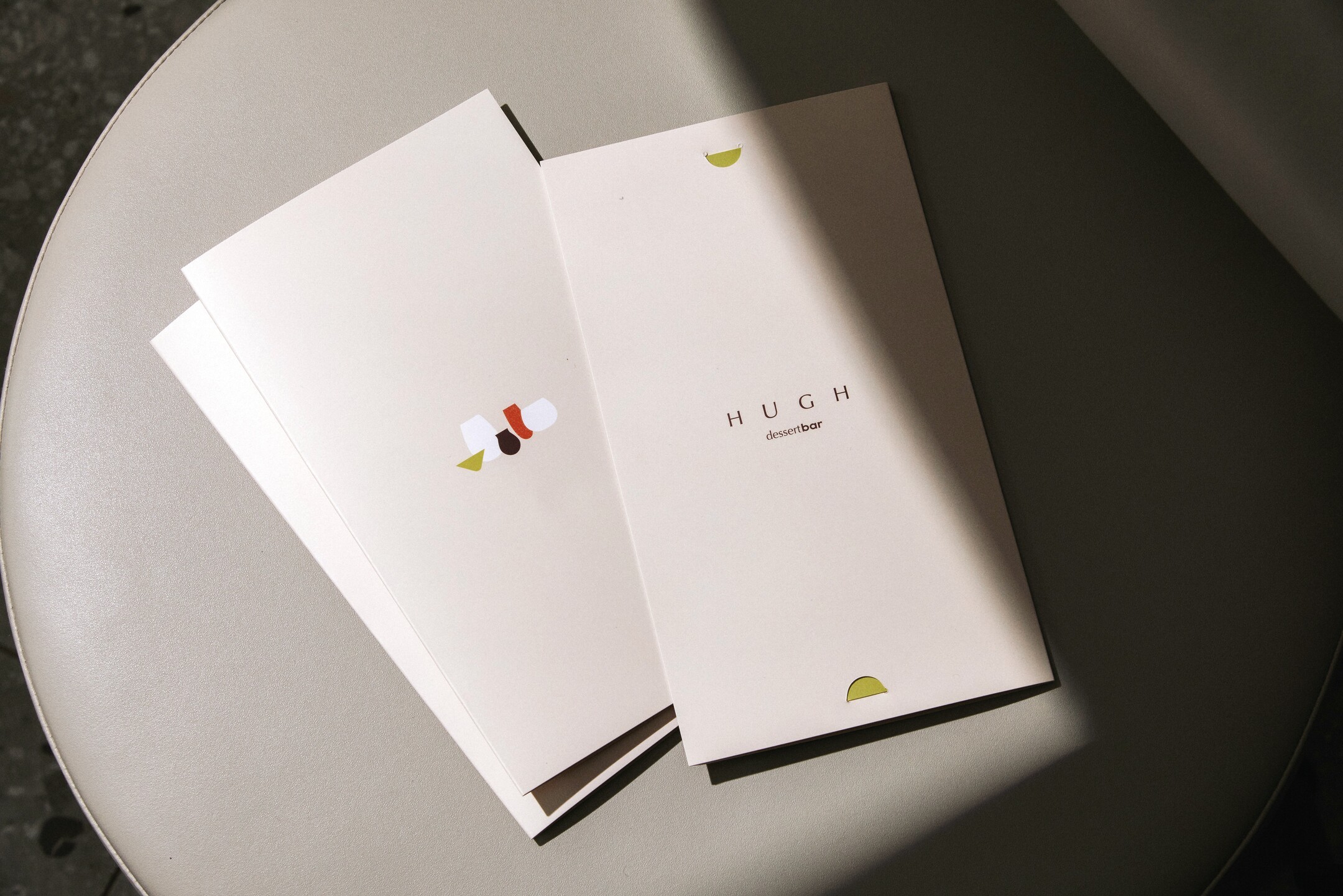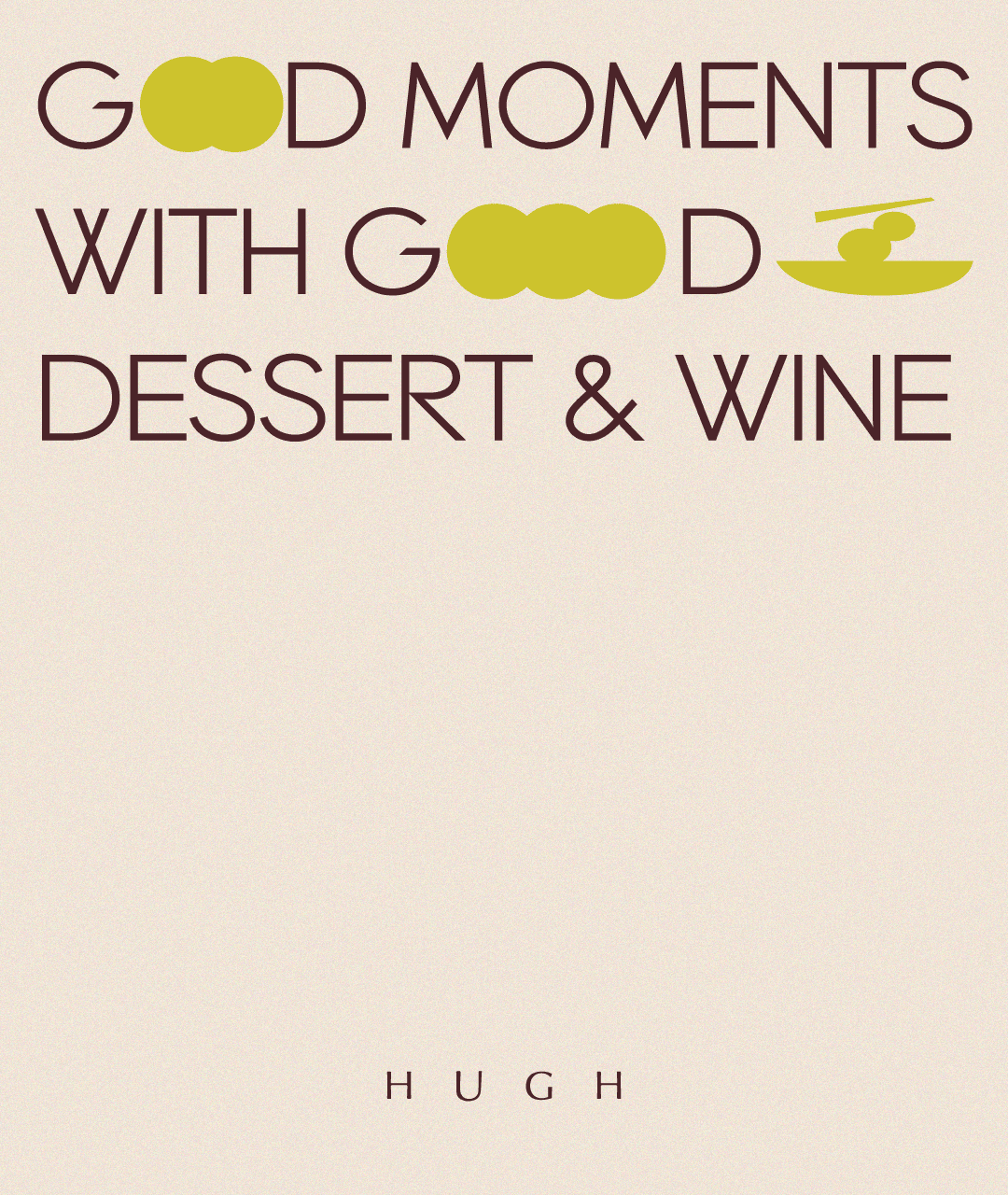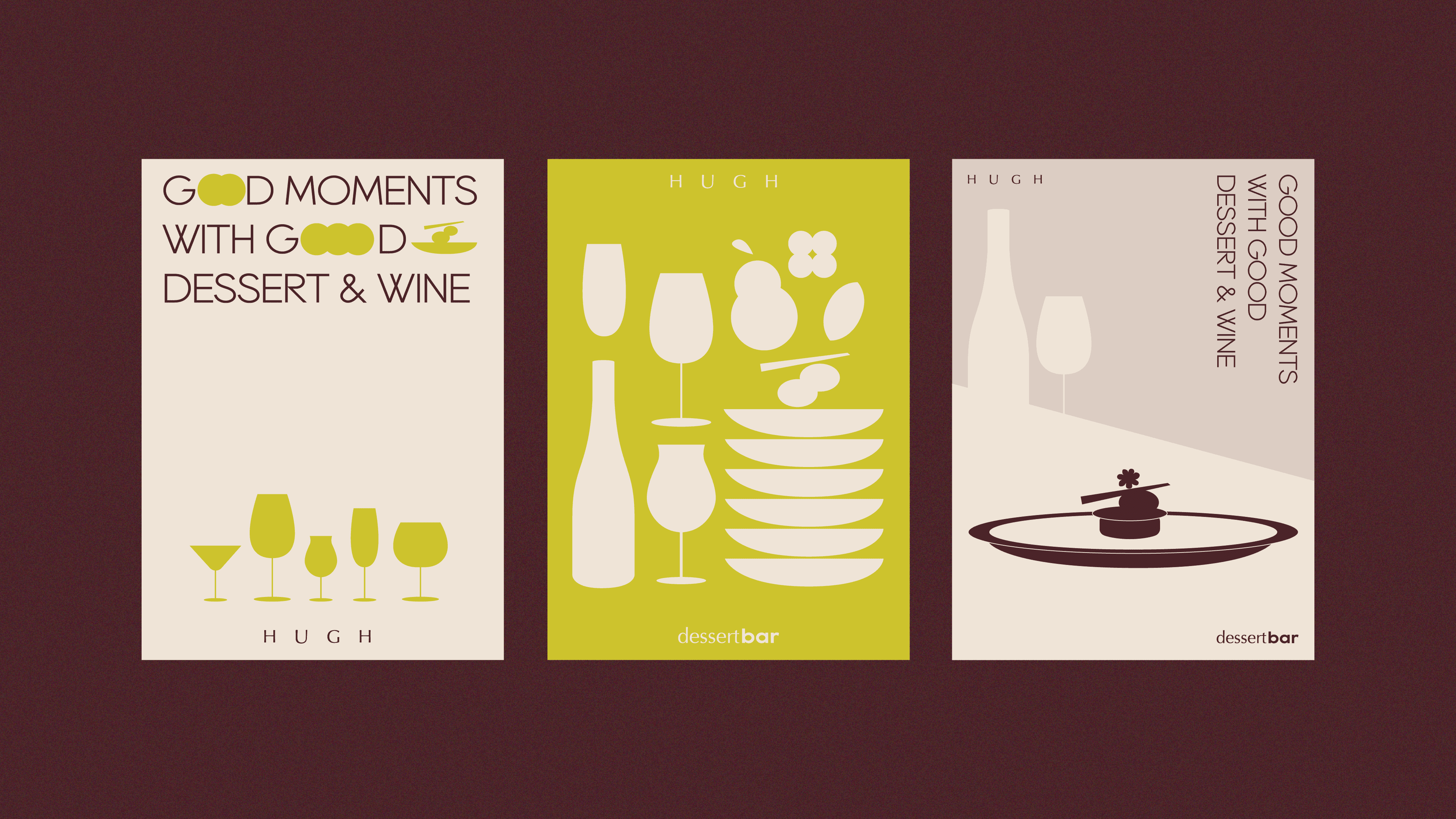 The brand design for HUGH Dessert Bar is centered around a neutral, bright, and warm tone, complemented by vibrant elements inspired by the colors of wine. A minimalist geometric design ensures a clean and sophisticated style, while the logo features geometric shapes symbolizing a wine glass placed on a flat tabletop, capturing the essence of simplicity and elegance.