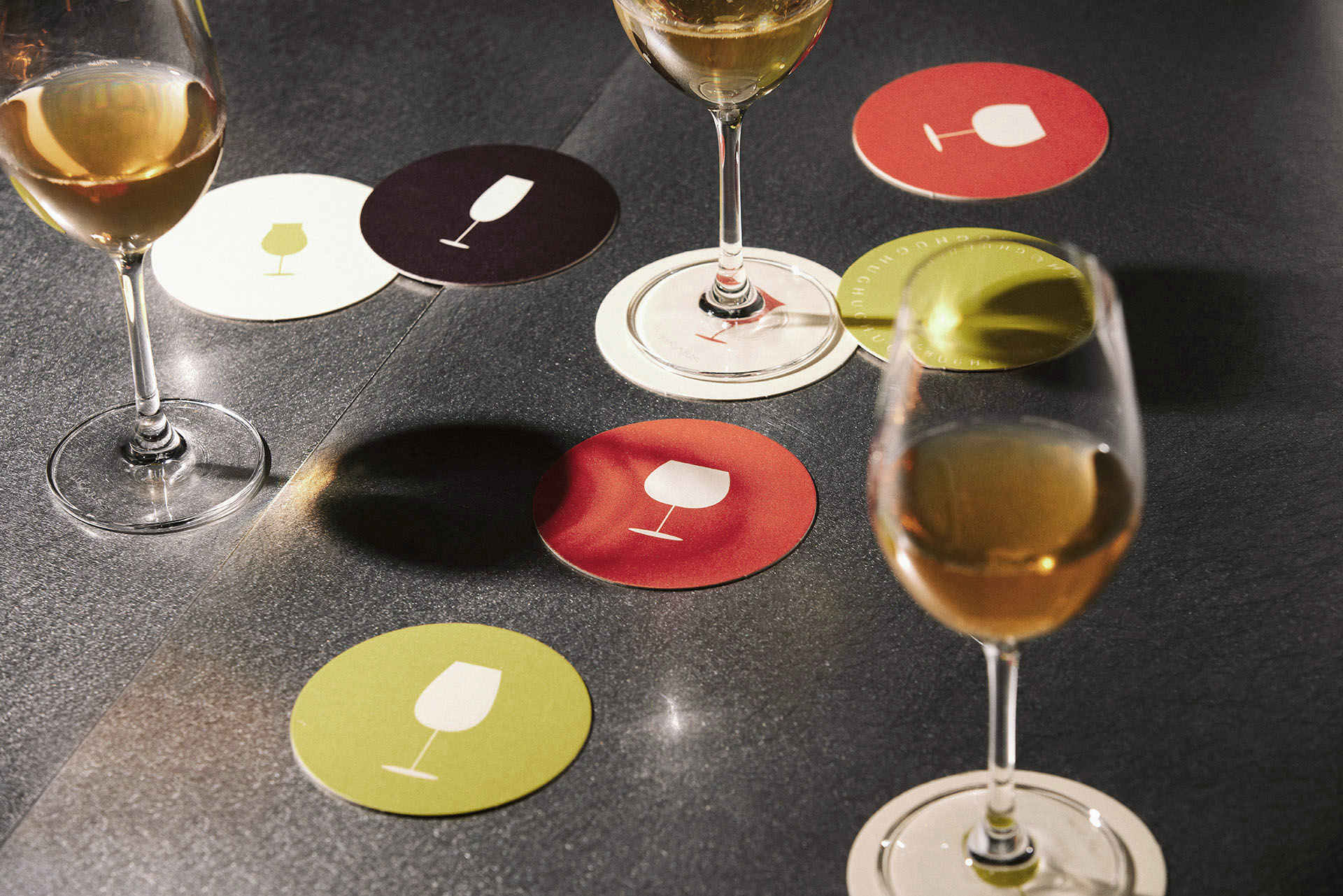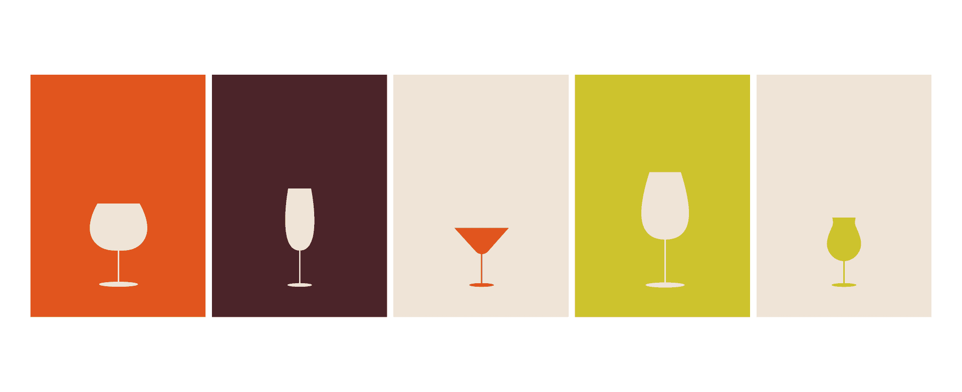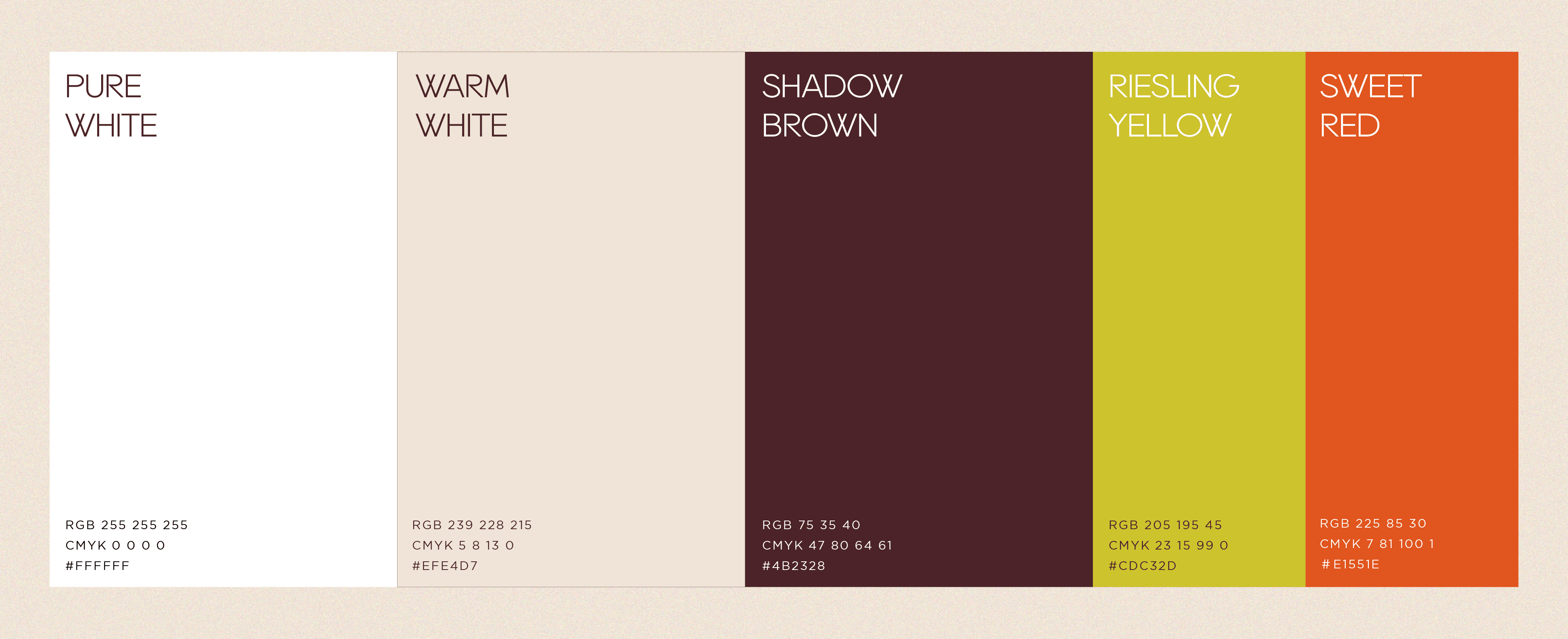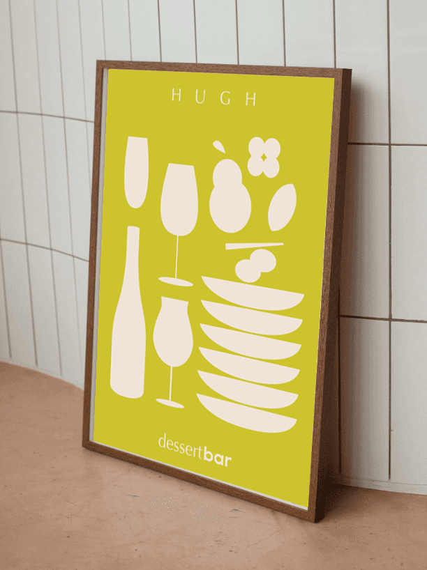 The brand design for HUGH Dessert Bar is centered around a neutral, bright, and warm tone, complemented by vibrant elements inspired by the colors of wine. A minimalist geometric design ensures a clean and sophisticated style, while the logo features geometric shapes symbolizing a wine glass placed on a flat tabletop, capturing the essence of simplicity and elegance.